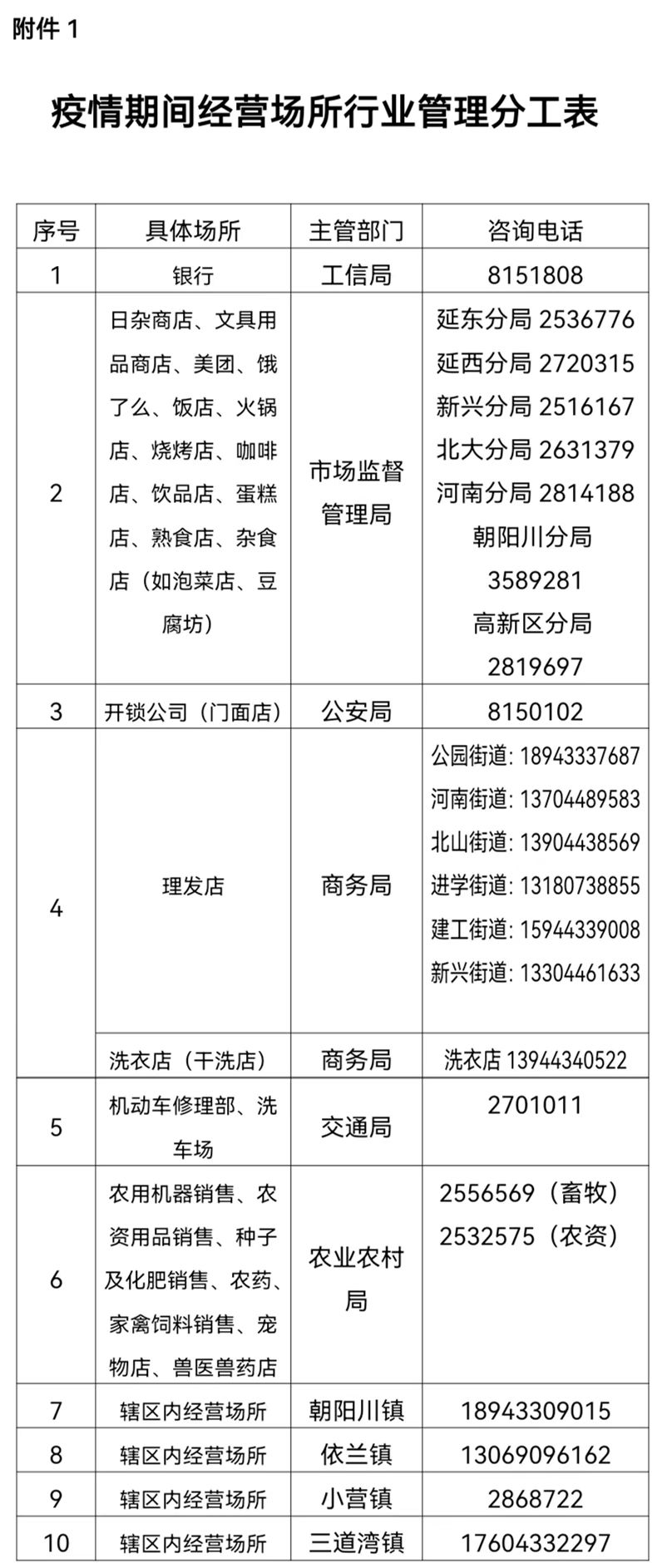 부록: 1. 전염병예방통제기간 경영장소 업종관리 분공표