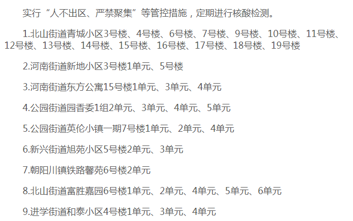 '구역 봉쇄, 외출 금지, 문전 봉사' 등 관리통제조치를 실시하고 정기적으로 핵산검측을 진행한다.