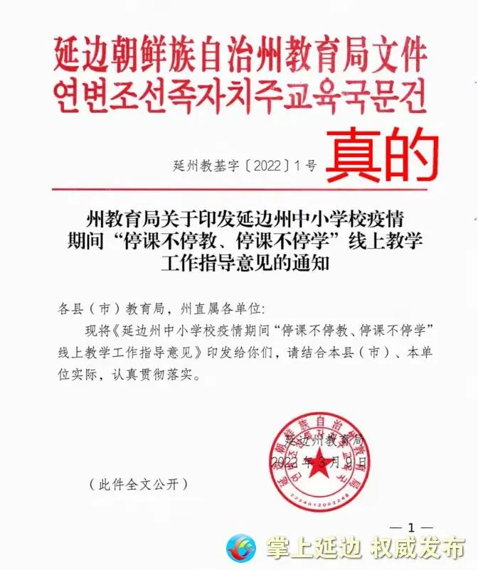 4월 1일 일부 독자들은 위챗모멘트에서 일부 사람들이 문건번호가 "연주교기자[2022] 1호" 연변주교육문건을 전재한 것을 보았는데 문건에는 "4월 6일부터 연변주 모든 중소학교의 전체 학생 및 부분적 교원들이 학교에 복귀한다. 학교에 복귀하는 학생들은 3차 핵산검측 음성보고를 제시하고 교정에 진입할 수 있다."고 씌여 있었다. 기자는 이 문제를 가지고 주교육국 기초교육처 처장 교건응을 취재했다.