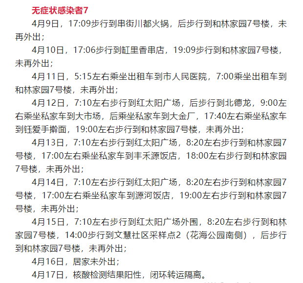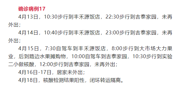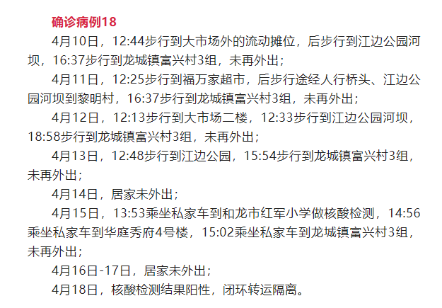 4월 18일 0-24시, 화룡시에서 본지방 확진병례 5례(경증형) , 무증상 감염자 1명이 새로 증가됐다. 이 확진병례와 무증상 감염자의 이동경로는 다음과 같다.