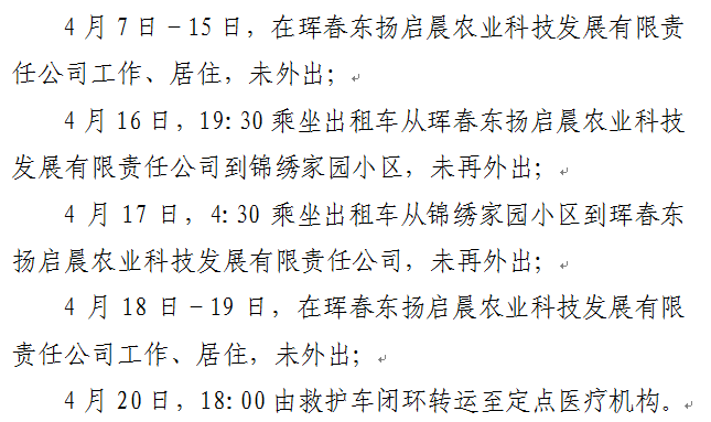 4월 20일 0-18시, 훈춘시에서 무증상 감염자 1명이 새로 증가됐다. 이 감염자의 이동경로는 다음과 같다.