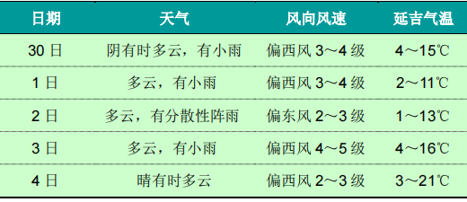 1.'5.1'절 련휴기간 흐리고 비오는 날씨가 많아 방역물자 운송, 생활물자 운송, 실외 핵산검측, 검사구역 근무 등 전염병 예방통제사업에 불리한 영향을 끼칠 수 있어 각지에서는 사전에 잘 대응해야 한다. 해당 부문에서 교통안전관리를 강화하고 차량과 행인은 안전에 주의할 것이 요청된다.