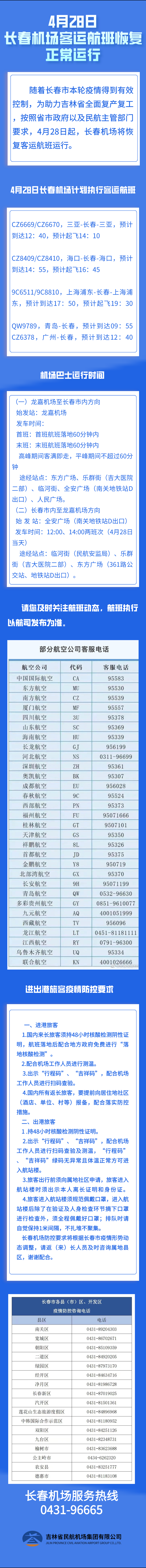 장춘시 이번 라운드 전염병상황이 효과적으로 통제되면서 길림성의 전면적인 업무 복귀 생산 재개에 조력하고저 성 및 시 정부와 민항주관부문의 요구에 따라 4월 28일부터 장춘공항은 항공편 운행을 재개했다.