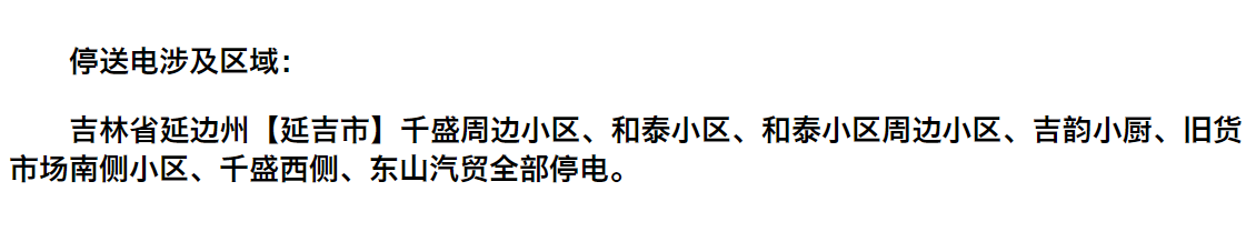 정전구역: 길림성연변주【연길시】천성주변 주택단지, 화태주택단지 및 그 주변 주택단지, 길운식당, 중고시장 남측 골목, 천성 서측, 동산자동차무역성 구역이 전부 정전된다.