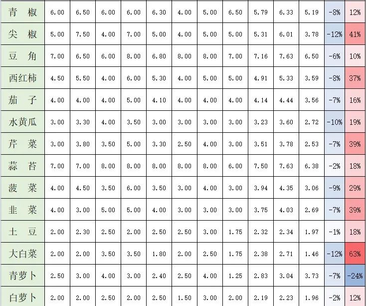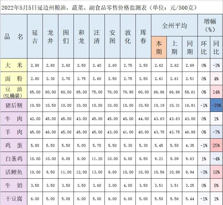 연변주 알곡, 기름, 남새, 부식품 소매가격 감측표 (5월 5일)