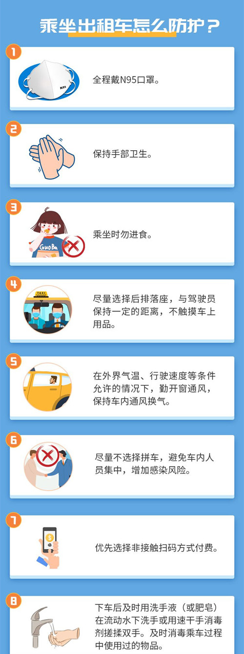 택시 타기 전: 온라인 플랫폼을 통해 예약하는 것이 좋다. 기사님과 먼저 련락을 승차 장소, 목적지 및 로선을 명확하게 하여 승차 후의 교류를 줄여야 한다. 외출 전에는 관련 요구에 따라 마스크를 규범적으로 착용해야 한다. 주의할 점은 모든 마스크가 감염 예방 역할을 하는 것은 아니라는 점에 유념해야 하는데 례하면 종이 마스크, 활성탄마스크, 면사마스크, 호기밸브가 달린 마스크, 자외선차단마스크 등은 소재와 구조가 치밀하지 못하여 예방효과가 제한적이므로 착용을 권장하지 않는다. 이밖에 휴대용 손소독제는 손소독제를 지참하여 손을 씻을 수 있는 시설이 없거나 손의 눈에 띄는 오염이 없는 경우에는 손소독제를 사용할 수 있다.