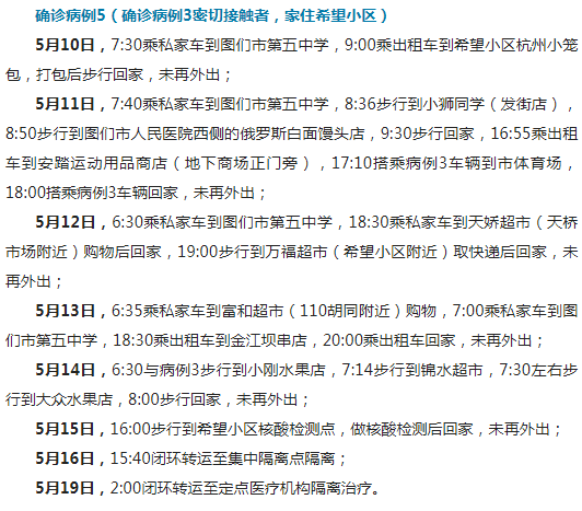 5월 19일 0-24시, 도문시에서 본지방 확진병례 2례(경증형)가 새로 증가되였는데 모두 관리통제인원이다. 5월 14일 이후로, 확진병례 도합 6례(모두 경증형)가 보고되였다. 아래는 새로 증가된 확진병례의 이동경로이다.