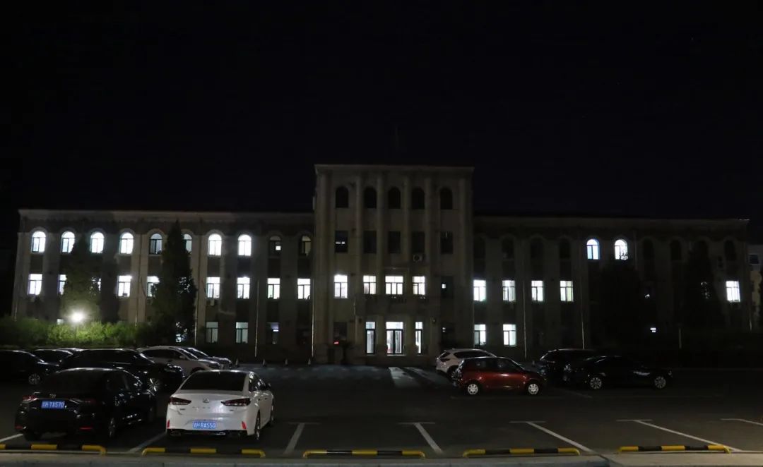 학교 청사에 켜진 전등이