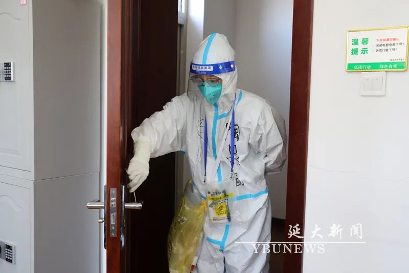 의료사업일군들이 학생기숙사에서 핵산검측을 해주고 있다.