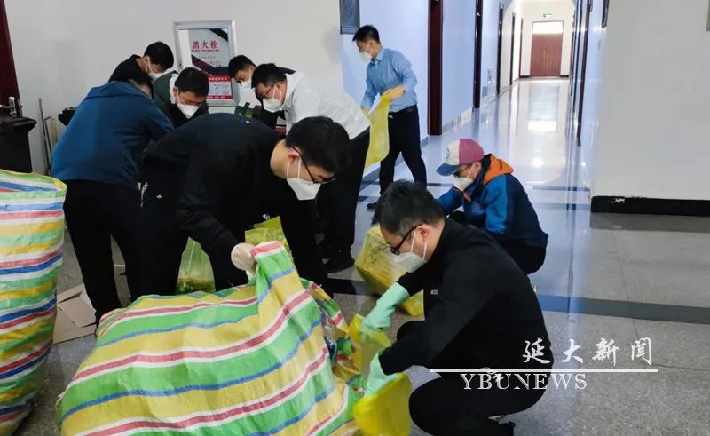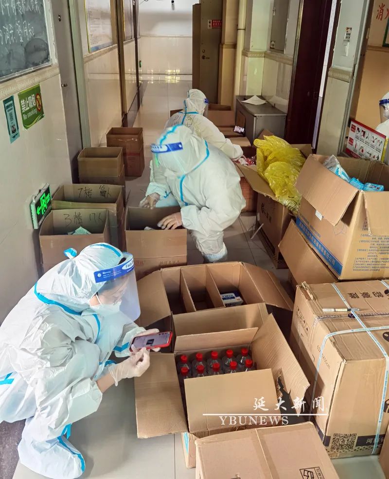 학생기숙사에 살고 있는 교원과 자원봉사자들이 방역물자를 분류, 발급하고 있다.
