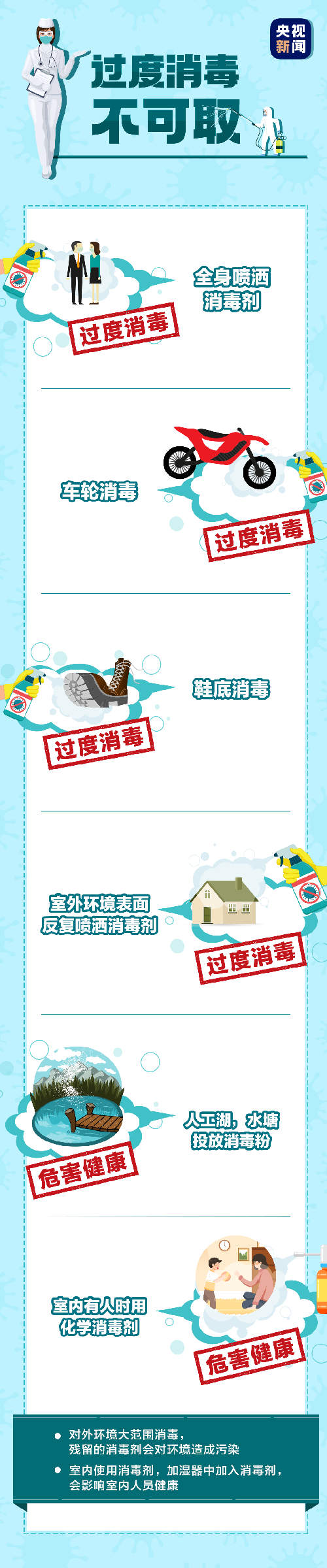많은 학부모들은 아이가 집에 들어오기 전 소독수를 아이 몸에 마구 분무하는 습관이 있는데 이렇게 하면 바이러스를 철저하게 제거할 수 있다고 생각한다. 심지어 일부 사람들은 한번에 1,500ml에 달하는 소독수를 전부 사용하는 경우도 있다. 사실상 소독수는 적당하게 적당한 량을 사용해야 한다.