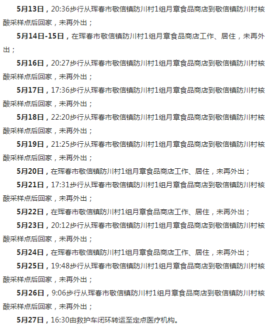 5월 27일 0-24시, 훈춘시에서 본지방 확진병례 1례(일반형)가 새로 증가되였다. 새로 증가된 확진병례의 이동경로는 다음과 같다.
