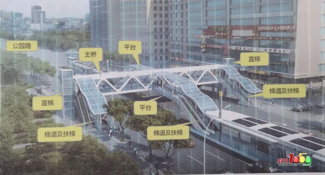 "구름다리에는 출입구 8개가 설치됩니다. 남북 량측에 각기 엘리베이터 하나씩 설치되여 무장애 통로를 형성하게 되는데 시민들은 엘리베이터를 타고 구름다리에 올라 길을 건널 수 있습니다. 남북 량측에 에스컬레이터와 보행계단이 설치되며 중간 량측 쾌속공공뻐스역에 설치된 보행계단과 에스컬레이터로도 이동할 수 있습니다. 쾌속공공뻐스를 탑승하려는 시민들은 구름다리 중간통로를 통해 쾌속공공뻐스역에 가면 됩니다."