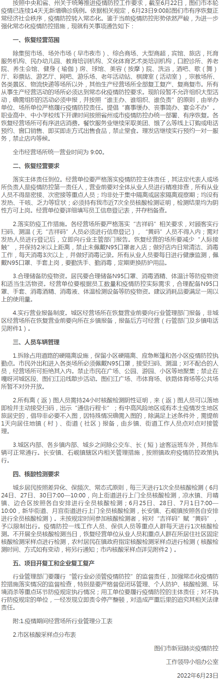 도문시가 통고를 발표하여 오늘(23일) 오전 9시부터 정상적인 경제사회질서를 점차 회복한다고 밝혔다. 통고는 6월 22일까지 도문시는 이미 14일간 신규 확진병례가 없었다고 전하면서 "집중무역시장, 옥외시장(아침시장과 저녁시장), 종합상가, 대형슈퍼, 호텔, 려관, 탁아교육봉사기구, 민영유치원, 교육양성기구, 문화체육예술류양성기구, 구강진료소, 양로원, 양생회관, 헬스장, 체육관, 미용(안마)원, 사우나, 술집, 가무청, 복권점, 게임방, PC방, 오락장소, 로년활동장소, 장기바둑실(활동실), 종교장소, 각종 풍경구, 물류택배 등 장소외 기타 생산경영장소는 전부 영업을 재개한다고 밝혔다. 하지만 식당내 식사는 여전히 금지된다.