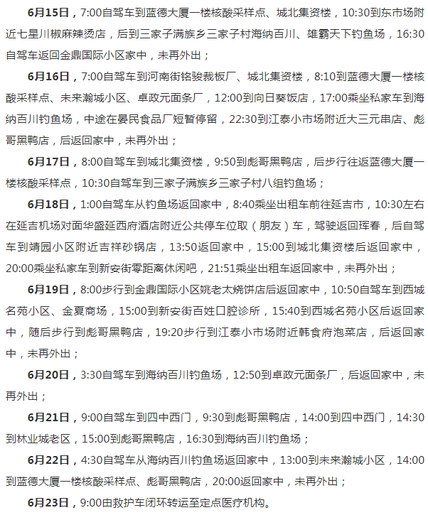 6월 23일 0-24시, 훈춘시에서 본지방 무증상 감염자 1명이 새로 증가되였다. 이 감염자의 이동경로는 다음과 같다.