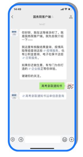 2. ‘국무원 클라이언트’ 서비스 페이지 대화창에 '대학입시 합격통지서' 키워드를 입력하면 서비스엔트리(服务入口)를 원클릭으로 획득할 수 있다.