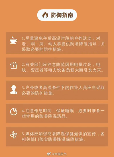 중앙기상청은 7월 13일 06시에 고온등색초기경보를 계속 발령하여 7월 13일 낮에 강소 남부, 절강 북부, 사천 동남부, 중경 대부분, 운남 동북부 부분지역의 기온이 40℃에 이를 것으로 예측했다.