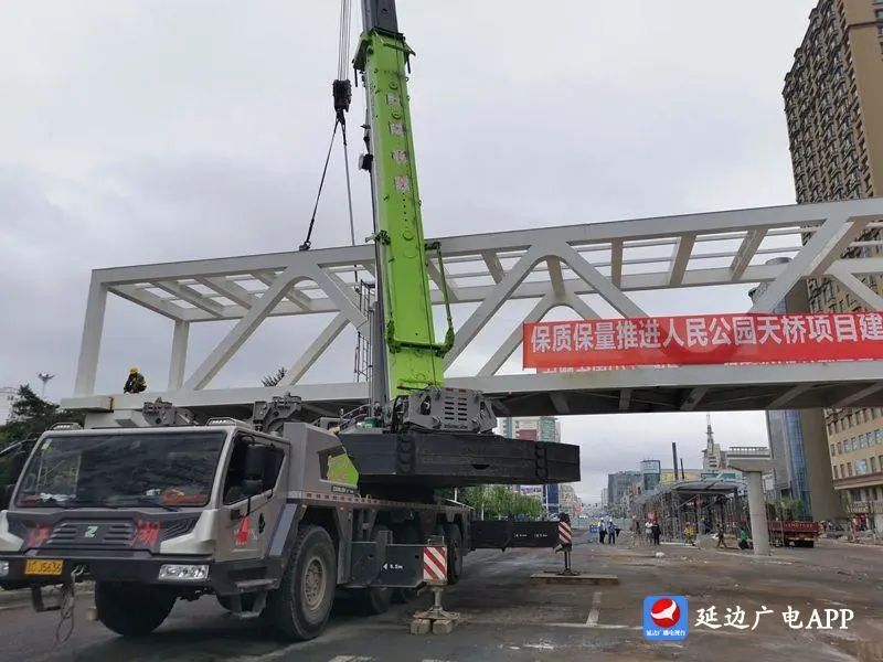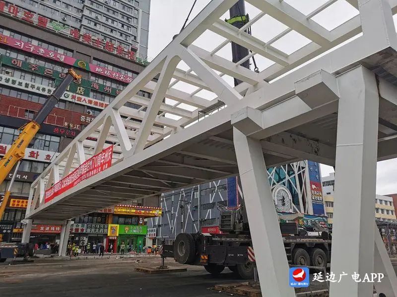 7월 17일 7시 기자는 연길공원육교건설대상 현장에서 시공일군들이 기중기로 강철구조주체를 설치하는 것을 목격했다.