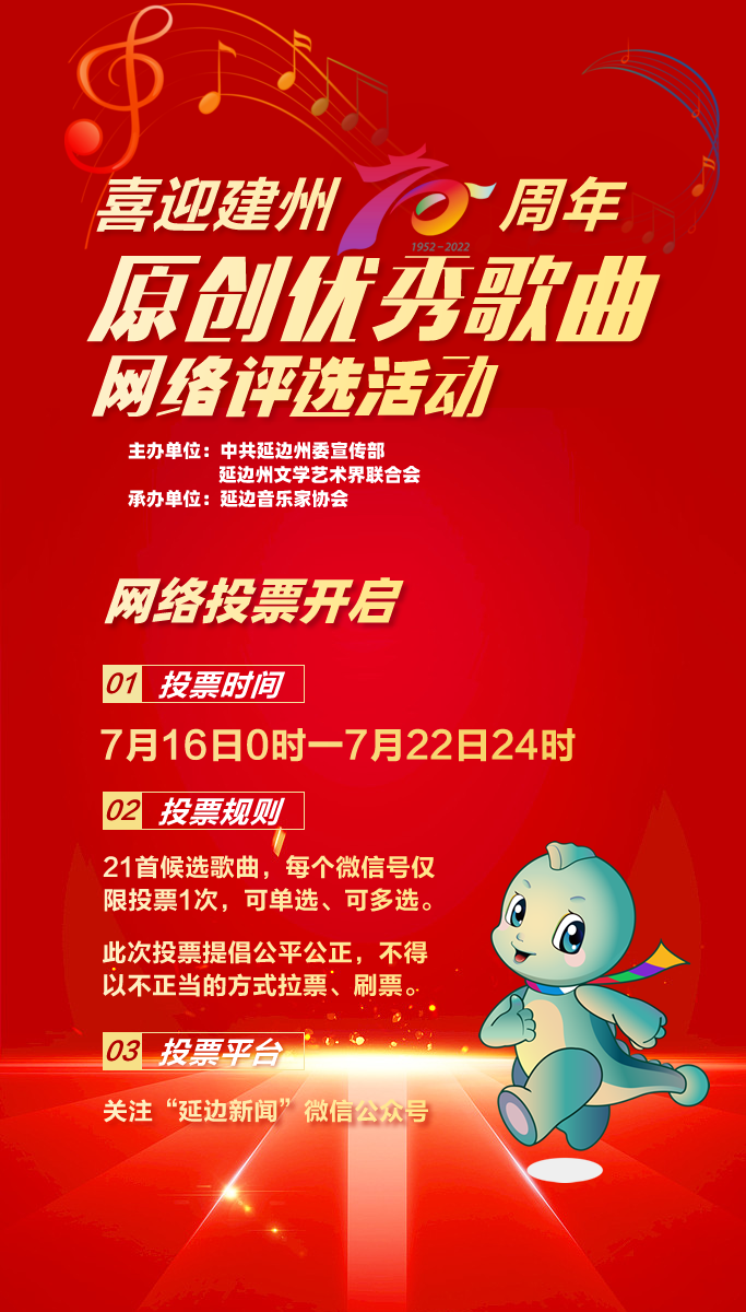 올해 9월 3일은 연변조선족자치주 창립 70주년 기념일입니다. 자치주 창립 70주년을 맞아 열렬하고 경사스러우며 즐거운 자치주 창립 경축 분위기를 적극 조성하고 아름다운 노래와 운률로 연변을 찬미하고 위대한 시대를 노래하며 당과 조국에 대한 연변인민의 열애의 정과 고향을 사랑하는 마음을 표달하고 연변 여러 민족 인민의 단결, 변강안정, 경제발전, 사회조화 등 면에서 이룩한 뚜렷한 성적을 전시하며 전 주 여러 민족 인민이 습근평동지를 핵심으로 하는 당중앙의 령도하에 두번째 백년 분투목표와 중화민족 위대한 부흥의 중국꿈을 실현하기 위해 사회주의 현대화 신연변을 건설하는 로정에서 새시대 연변 고품질 발전의 새로운 장을 써내려가는 아름다운 미래를 열어나가고저 주문학예술계련합회는 전사회를 향해 연변조선족자치주 창립 70주년 경축 원곡을 널리 응모하여 자치주 창립 70주년에 성대히 헌례하려고 합니다.