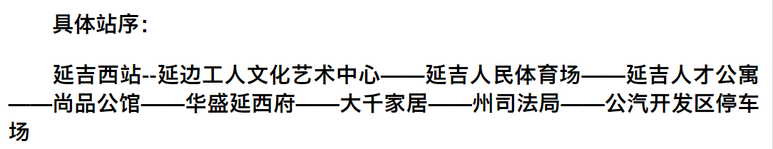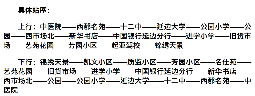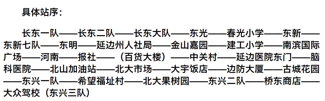 "중의원"으로부터 "공원소학교" 구간 조정: 중의원역에서 리화로를 따라 서쪽으로 운행하다가 진달래북쪽거리에서 공원로에 진입한 후 원래 로선을 회복한다. 공신, 천지수부(이스터영화관), 관광국 서(북측), 상우대호텔 역을 취소하고 서군명원, 12중, 연변대학 역을 증설한다.