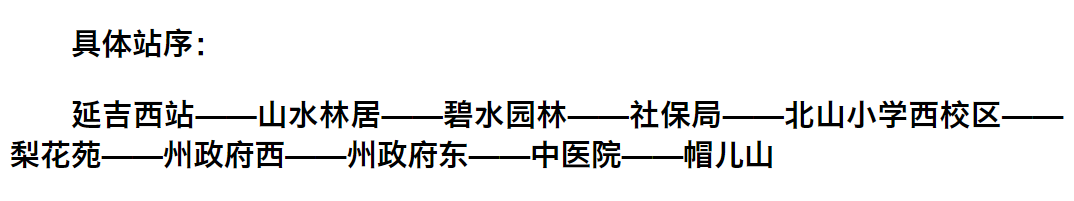 연천거리를 경유하여 천지로에 진입한 후 원래 로선을 회복한다. 산수림거, 벽수원림, 사회보험국, 북산소학교 서부캠퍼스, 만달광장 동, 만달광장, 주배전회사 역을 취소한다.