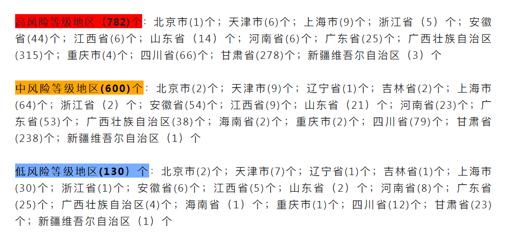 고위험등급 지역 782곳:북경시 1곳, 천진시 6곳, 상해시 9곳, 절강성 5곳, 안휘성 44곳, 강서성 6곳, 산동성 14곳, 하남성 6곳, 광동성 25곳, 광서쫭족자치구 315곳, 중경시 4곳, 사천성 66곳, 감숙성 278곳, 신강위글자치구 3곳