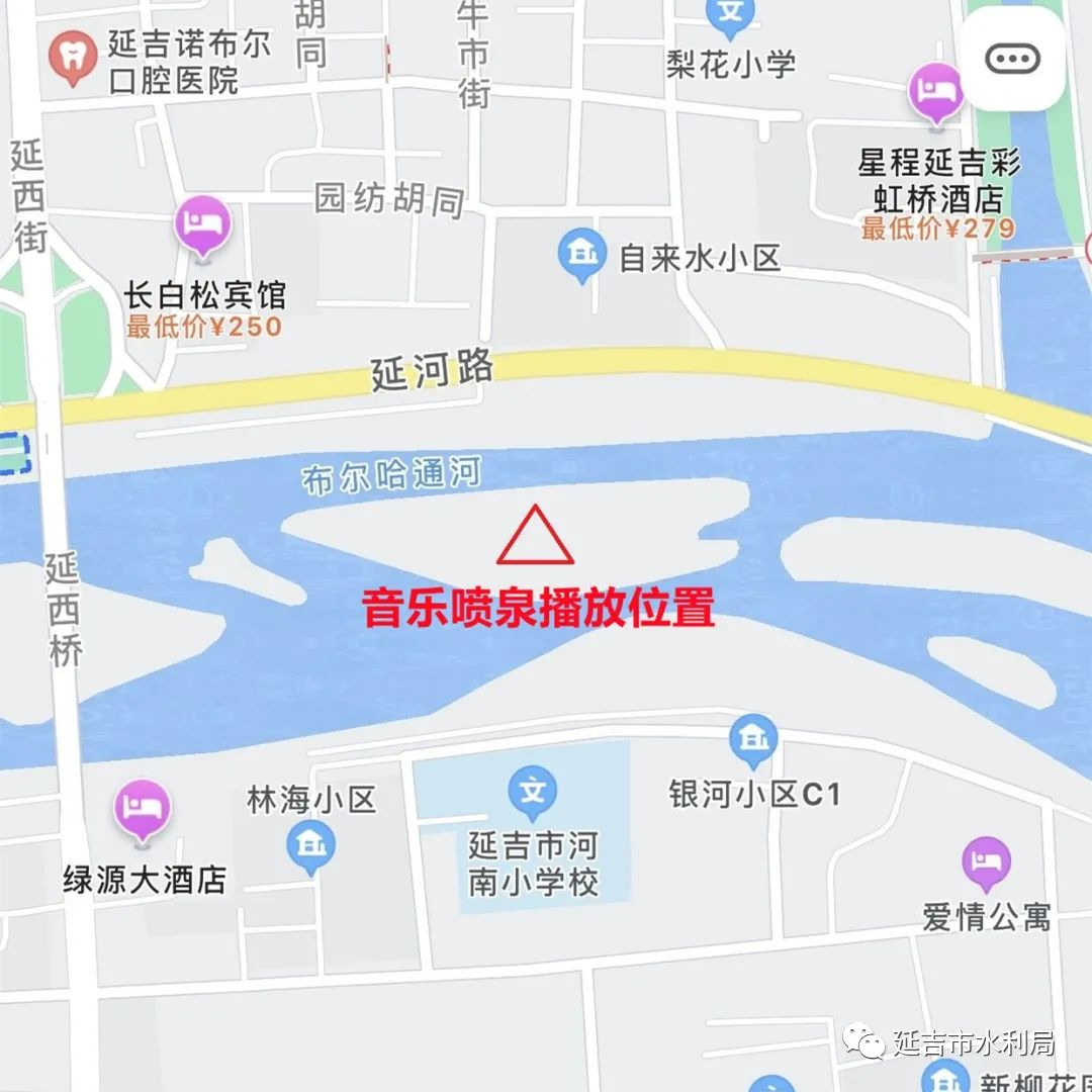연길시음악분수는 연길시구역 연길대교와 연신교 사이의 부르하통하 하면에 위치해 있다. 부르하통하 대형수상음악분수는 전체 길이가 158메터, 너비 12메터, 분사꼭지 386로 최고 80메터의 물기둥을 분사할 수 있으며 음악공연 '룡행천하' '하늘옥기둥' 등 여러가지 수무형태를 낼 수 있다. 이는 연변조선족민족특색과 문명도시형상을 충분히 전시함으로써 시민과 관광객들에게 우아하고 아름다운 시각성연을 제공하게 된다.