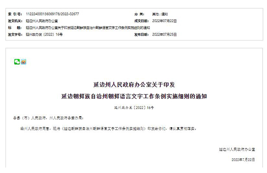 일전, 중앙민족사업회의의 정신을 심층적으로 관철락착하고 조선언어문자사업을 가일층 규범화하기 위해 연변 주당위, 주정부가 배치하고 주언어문자사업위원회 판공실이 앞장서서 <중화인민공화국 국가통용언어문자법>, <연변조선족자치주 조선언어문자사업조례> 등 관련 법률법규에 의거해 제정한 <연변조선족자치주 조선언어문자사업조례 실시세칙>(이하 <실시세칙>으로 략칭)이 반포되여 실시되였다.