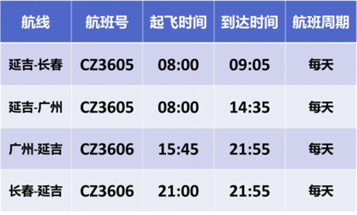남방항공 연길-장춘-광주 항공편은 CZ3605인데 08:00에 연길에서 출발하여 09:05에 장춘에 도착하며 09:55에 장춘에서 출발하고 14:35에 광주에 도착한다. 광주-장춘-연길 항공편은 CZ3606인데 15:45에 광주에서 출발하여 20:10에 장춘에 도착하며 21:00에 장춘에서 출발하고 21:55에 연길에 도착한다. 이 왕복 항공편은 매일 한편씩 운행할 계획이다.