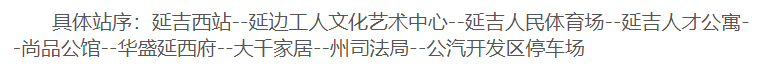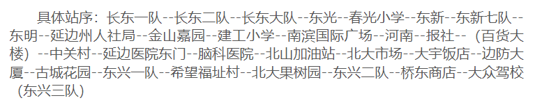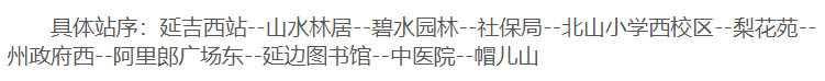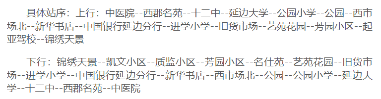 중의원역에서 리화로를 따라 서쪽으로 운행하다가 진달래북쪽거리를 경유하여 공원로에 진입한 후 원래 로선을 회복한다. 공신, 천지수부(이스터영화관), 관광국 서(북측), 상우대호텔 역을 취소하고 서군명원, 12중, 연변대학 역을 증설한다.