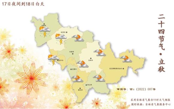 17일 밤부터 18일 낮까지 길림성은 맑다가 구름이 많이 끼며 백성, 송원, 사평 서부에 소나기 또는 천동과 번개를 동반한 소나기가 내린다.