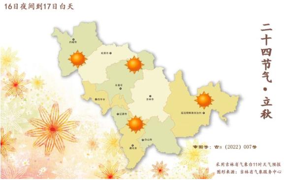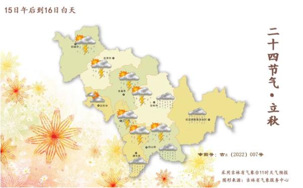15일 오후부터 16일 낮까지 길림성은 구름이 많으며 길림 동부, 통화 남부, 백산 남부, 연변, 장백산보호구역에는 중등 정도의 비가 내리고 일부 지방에는 폭우가 내리며 단시간 폭우, 천둥과 번개를 동반한 큰 바람 또는 우박 등 강대류 날씨가 나타난다. 백성, 송원, 장춘, 료원, 길림 서부, 통화 북부, 백산 북부에는 소나기 또는 천둥과 번개를 동반한 소나기가 내린다.