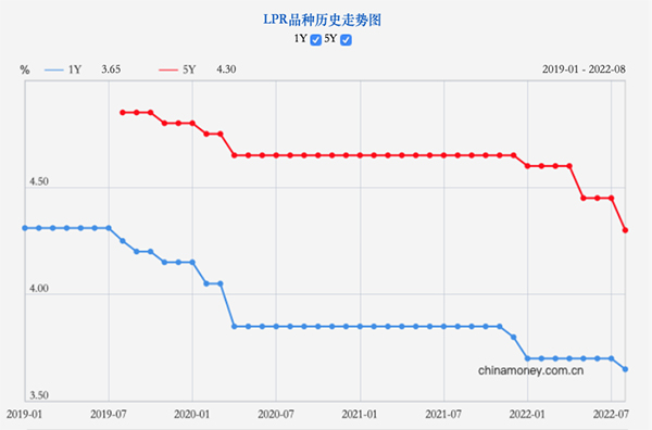 8월 22일, 중국인민은행은 전국은행간동업차대쎈터에 권한을 부여해 2022년 8월 22일 대출시세리금(LPR)을 다음과 같이 공포했다.