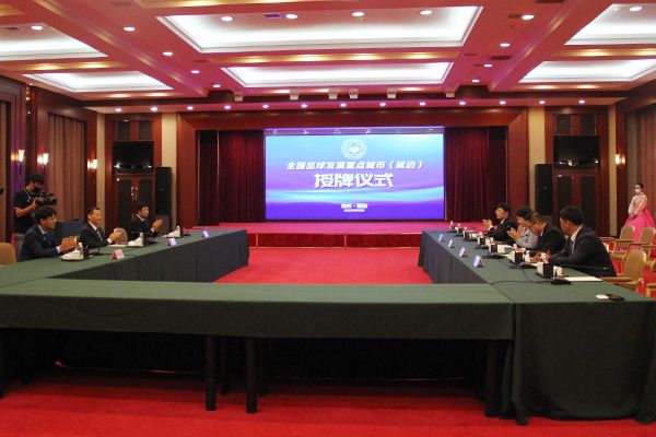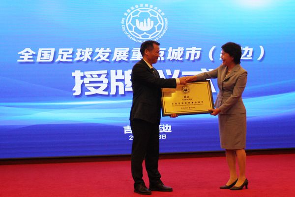 의식에서 중국축구협회 부비서장 하새가 국가체육총국과 중국축구협회를 대표하여 연변주 전국 축구발전중점도시 신청 심사평가결과를 통보하고 연변에 전국축구발전중점도시 현판을 수여했다.