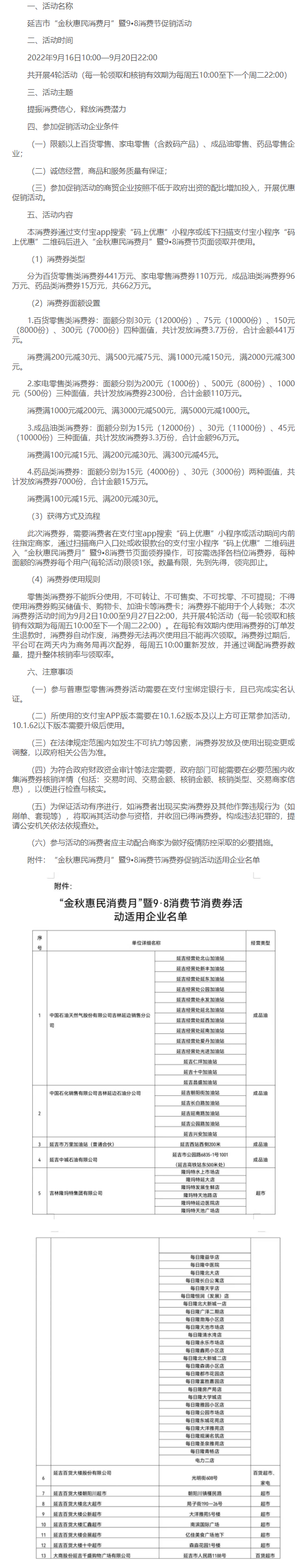성, 주, 시의 《전 성 경제안정에 관한 약간의 조치》와 길림성 제2회 9.8소비절 사업요구에 따라 연길시정부는 9월 16일부터 9월 20일까지 662만원을 투입하여 '금추혜민소비월' 및 9.8소비절(제3륜) 소비권 판촉활동을 전개하기로 결정했다. 구체 활동방안은 다음과 같다.