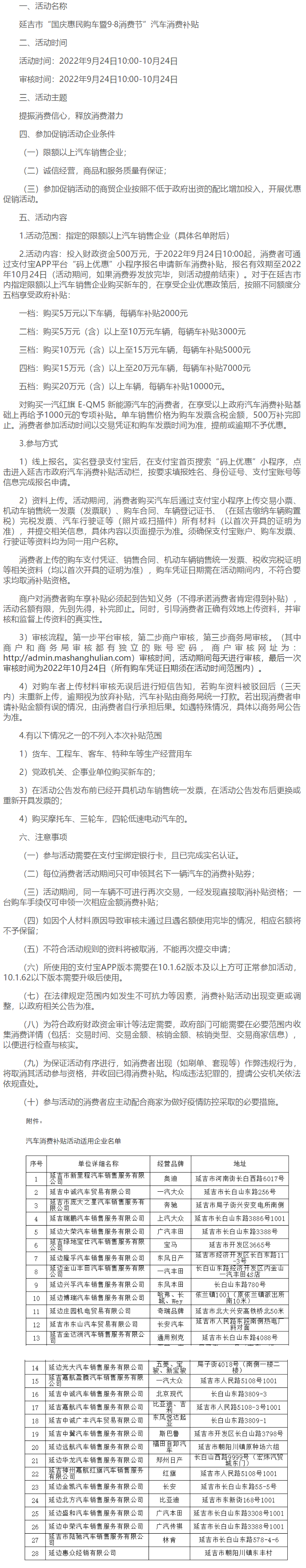 성, 주, 시의 《전 성 경제안정에 관한 약간의 조치》와 제2회 길림 9.8소비절 사업요구에 따라 국경절을 즈음하여 연길시정부는 2022년 9월 24일부터 500만원을 투입하여 '국경혜민 자동차 구매 및 9.8소비절' 자동차 소비 보조금 활동을 전개하기로 결정했다. 구체 활동방안은 다음과 같다.