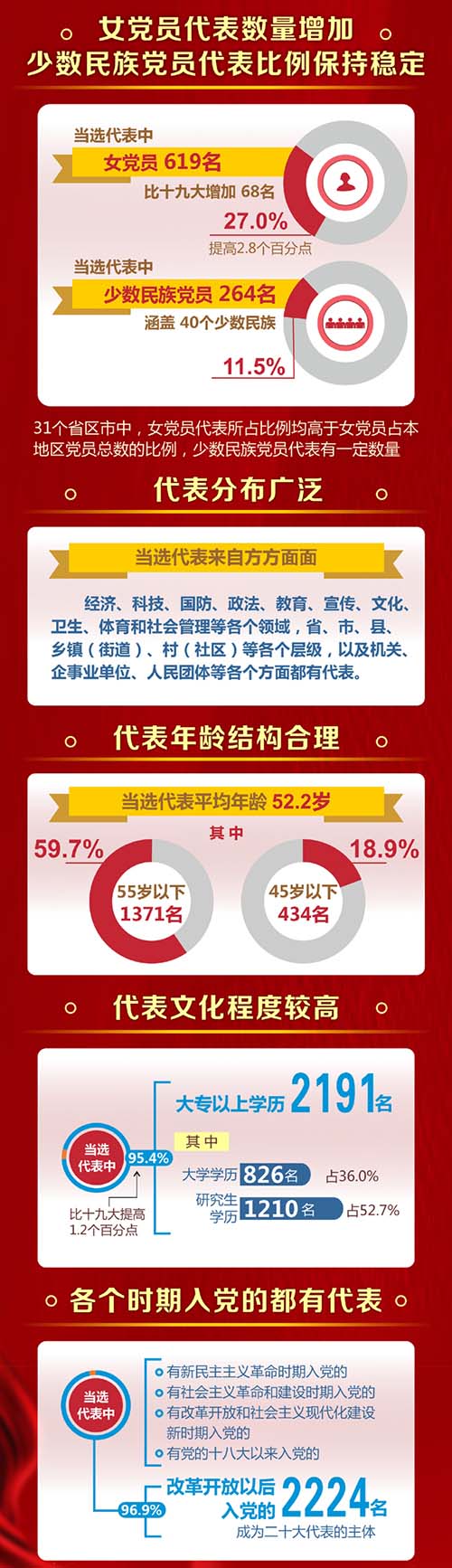 여섯째, 각 시기에 입당한 대표들이 두루 있다. 선출된 대표중에는 신민주주의혁명시기에 입당한 대표, 사회주의혁명과 건설 시기에 입당한 대표, 개혁개방과 사회주의현대화건설 시기에 입당한 대표, 제18차 당대회 이후 입당한 대표들이 있다. 이중 개혁개방 이후 입당한 대표는 2224명으로 96.9%를 차지해 20차 당대회 대표의 주체로 되였다.