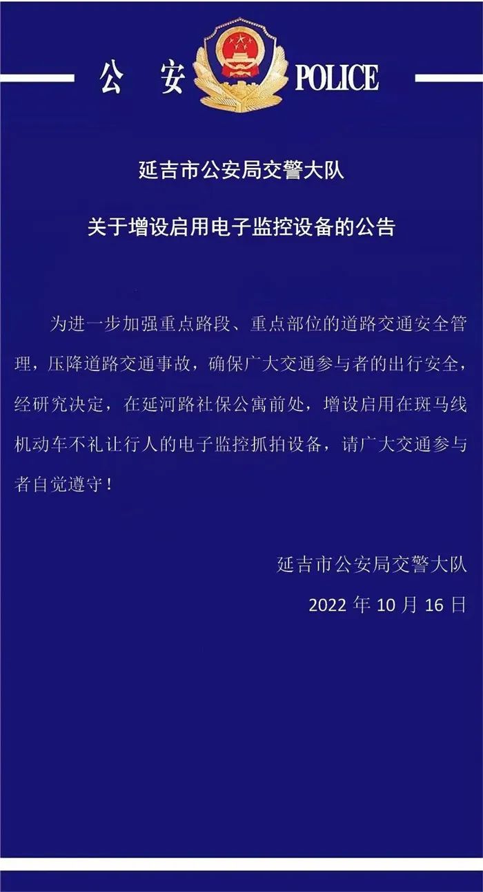 중점도로구간, 중점부위의 도로교통안전 관리를 일층 강화하고 도로 교통압력을 줄이며 광범한 교통참여자들의 출행안전을 확보하고저 연구를 거쳐 연하로 사회보험아빠트단지 앞에 감시카메라를 증설하여 기동차량이 횡단보도에서 행인에게 길을 양보하지 않는 위법행위에 대해 단속하기로 결정했다. 광범한 교통참여자들이 자각적으로 준수하기 바란다!