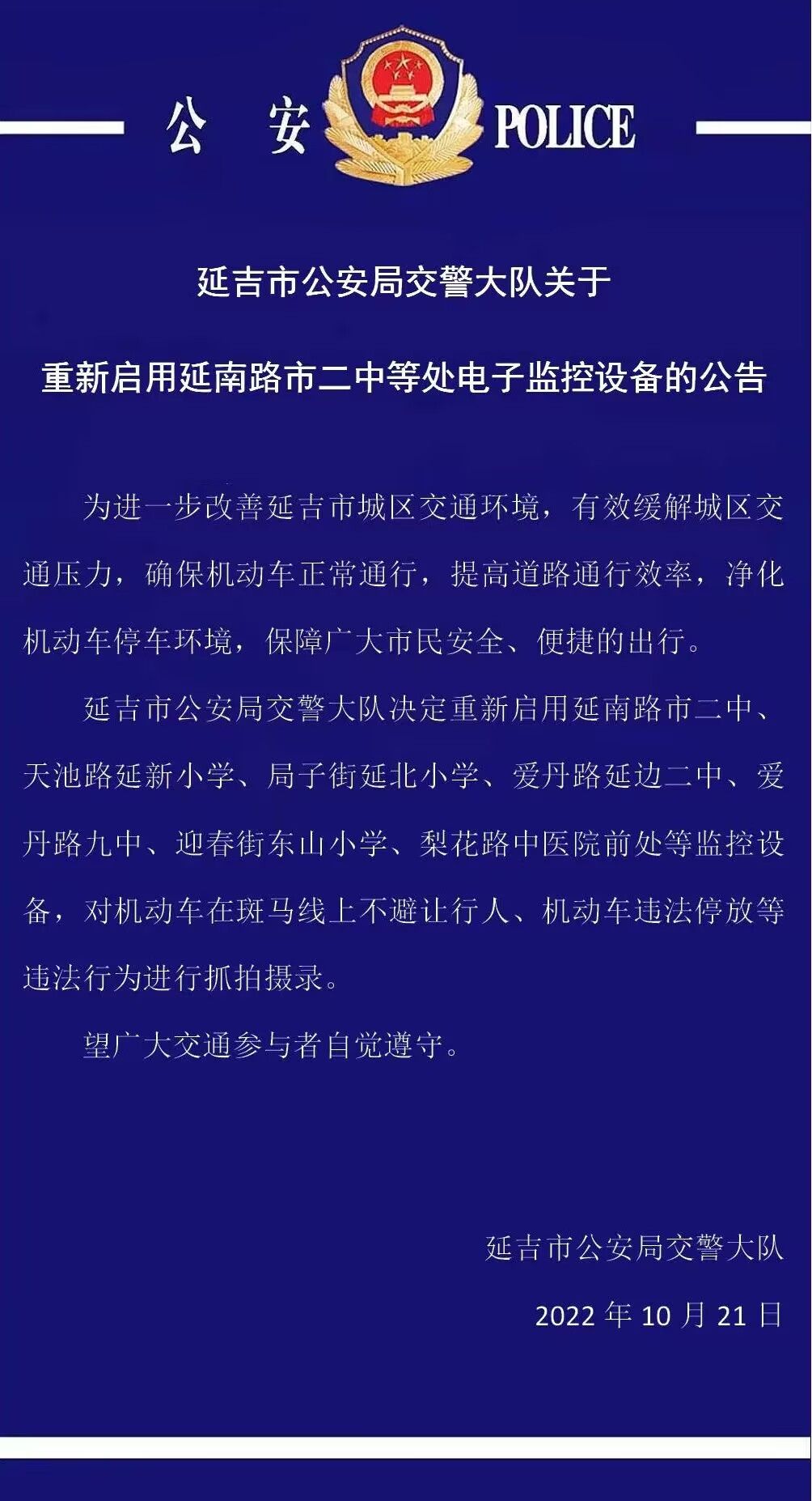 연길시 도심의 교통환경을 진일보 개선하고 교통압력을 효과적으로 완화시키며 동력차량의 정상통행을 확보하고 도로통행효률을 제고시키며 주차환경을 정화하고 시민들의 안전하고 편리한 출행을 보장하기 위해 연길시공안국 교통경찰대대는 연남로 시2중, 천지로 연신소학, 국자가 연북소학, 애단로 연변2중, 애단로 9중, 영춘가 동산소학, 리화로 중의원 앞 등 감시카메라를 재가동하고 동력차량이 횡단보도에서 행인을 양보하지 않거나 불법주차하는 등 행위를 촬영하기로 결정했다.