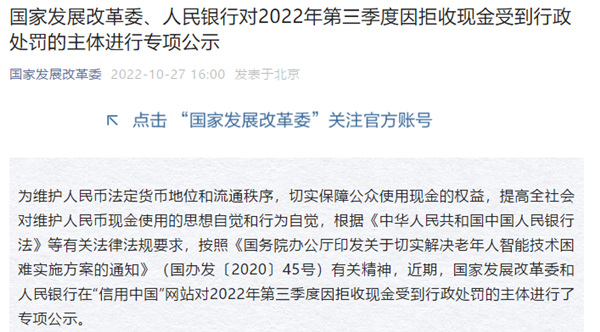 인민페의 법정화페 지위와 류통질서를 수호하고 대중의 현금사용 권익을 확실히 보장하며 인민페 현금사용에 대한 사회 전체의 사상자각과 행위자각을 제고하기 위해 <중화인민공화국 중국인민은행법> 등 관련 법규의 요구와 <국무원 판공청에서 인쇄발부한 로인의 스마트기술 어려움 해결 실시방안에 관한 통지》(국판발[2020]45호) 관련 정신에 따라 최근 국가발전개혁위원회와 중국인민은행은 ‘신용중국’사이트에 2022년 3분기 현금수령 거부로 행정처분을 받은 주체에 대해 특별공시를 진행했다.