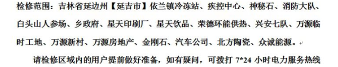 해당 구역내 사용호들이 미리 준비를 하고 의문이 있으면 7*24시간 전력봉사열선 0433-4314444 혹은 0433-4315555에 자문하기 바란다.