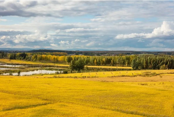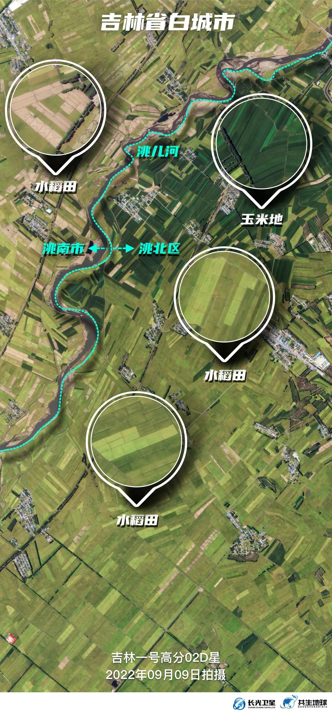 图为:卫星视角俯瞰吉林白城大地,早水稻田已经片片金黄 图片来源:吉林一号
