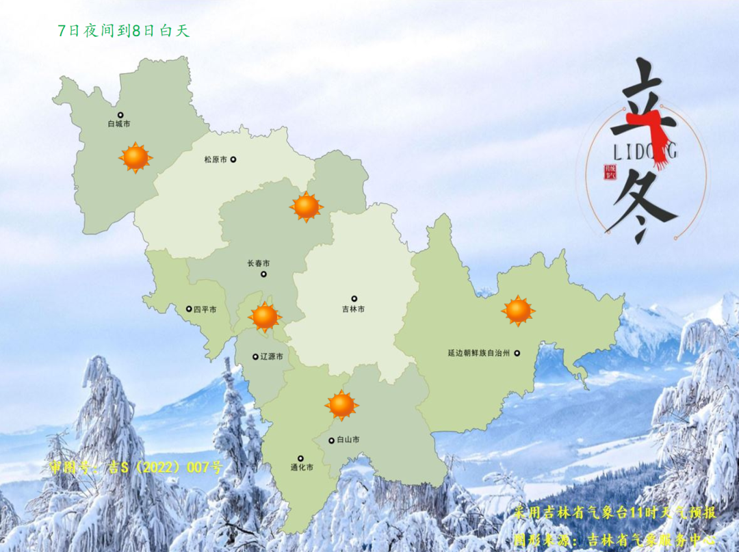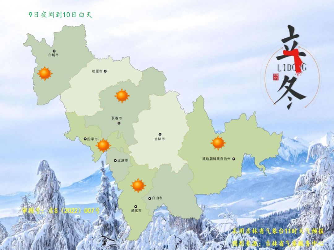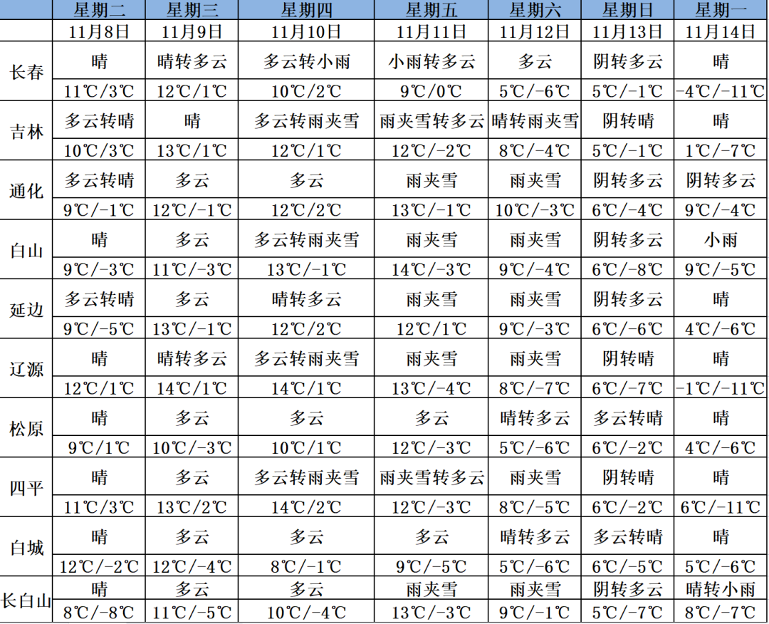 기상부문에서는 7일 , 동남부에 적은 비가 내리고 산간지역에 진눈까비가 내릴 것으로 예보하고 10-11일, 전 성 대부분 지역에 적은 비가 내리고 동남부 지역에 진눈까비가 내리겠으며 12-13일, 중동부 대부분 지역에 중등정도의 비가 내리던 데로부터 진눈까비 혹은 중등정도의 눈이 내리겠으며 부분적 지역에는 큰눈 혹은 폭설이 내리고 기타 지역은 적은 비가 내리던 데로부터 진눈까비 혹은 눈이 내릴 것으로 내다보고 있다.