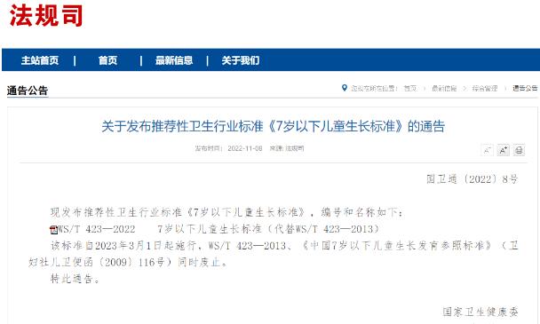 일전에 국가위생건강위원회는 <7세 미만 아동 성장기준>을 발부했다. 새로운 기준은 2023년 3월 1일부터 시행되는데 기존의 <5세 미만 아동의 성장상태 판단>을 대체한다. 동시에 <중국 7세 미만 아동 성장 및 발육 참조표준>도 페지된다.