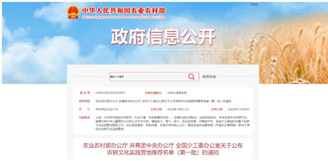 중국농민풍수절을 더욱 잘 조직하고 '내가 말하는 풍수이야기—앞다퉈 붉은넥타이 해설사가 되자' 실천체험활동을 착실히 전개하며 중화농경문화를 계승발양하고 소년아동들이 중화문명을 더 잘 료해하고 공감하도록 교육지도하며 패기, 기개, 저력을 증강시키기 위해 농업농촌부, 공청단중앙, 전국소년아동사업위원회는 농경문화실천캠프 추천사업을 조직전개했다. 단계별 추천, 자료심사, 전문가심사, 온라인공시를 거쳐 최근 <농경문화실천캠프 추천명단(제1차)>이 정식으로 발표되였는데 전국농업전시관(중국농업박물관) 등 60개 단위를 농경문화실천캠프로 추천했다.
