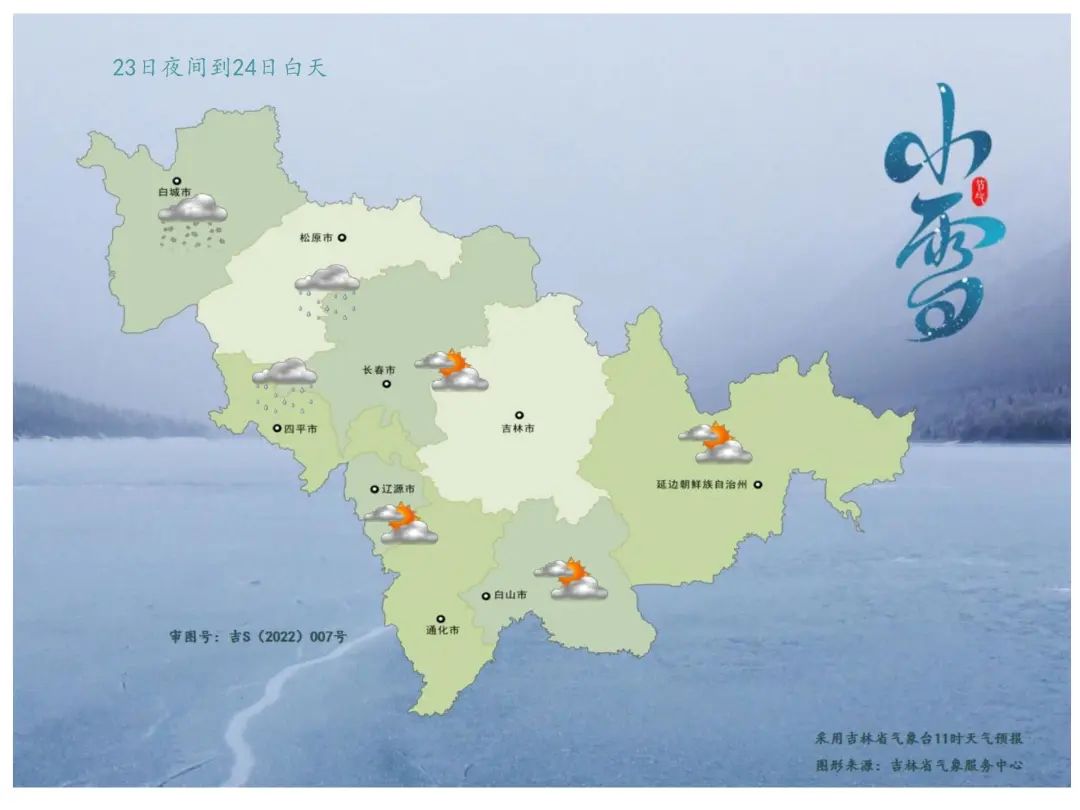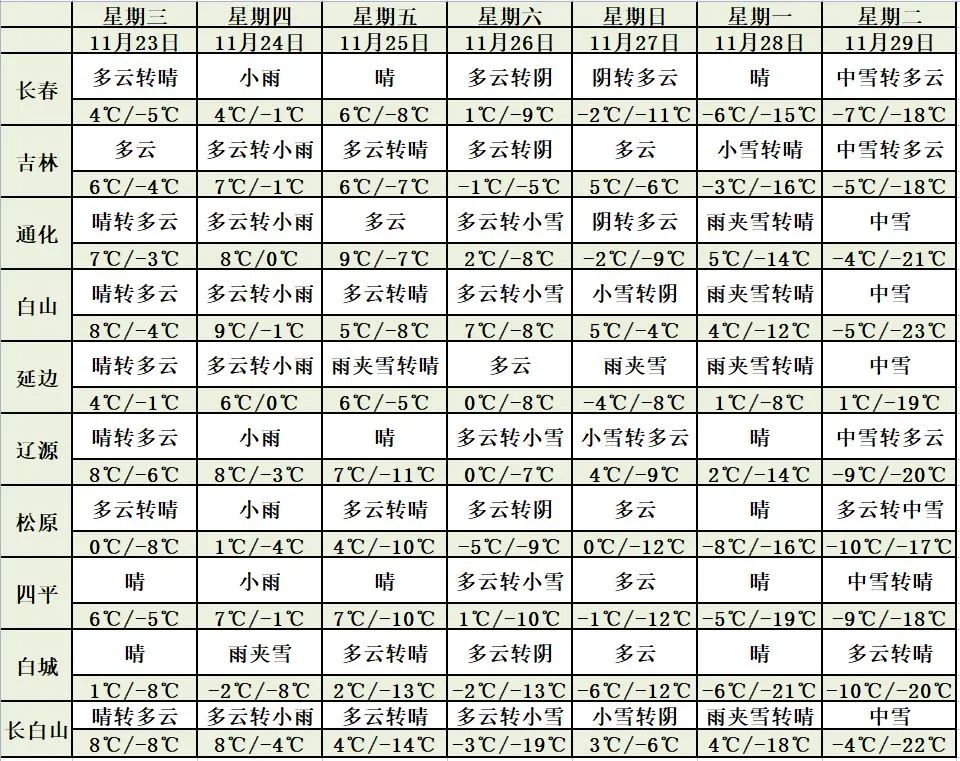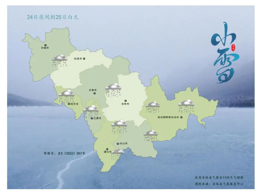 24일 밤부터 25일 낮까지 전 성은 구름이 많겠다. 백산 동부, 연변 서부, 장백산보호구에 진눈까비가 내리다가 중설로 바뀌고 통화 남부, 백산 서남부에 작은비에서 중비 혹은 진눈까비가 내리겠으며 백성, 송원에 작은 눈이 내리고 기타 지역에는 진눈까비 혹은 작은 비가 내리겠다.