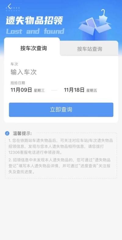 ① 철도12306 어플에서 ‘분실물 수령’을 찾아 차수와 기차역별로 분실물을 조회할 수 있다. 조회화면에서 만약 분실물과 부합되는 정보를 발견하면 12306고객서비스전화에 전화해 수령할 수 있다.