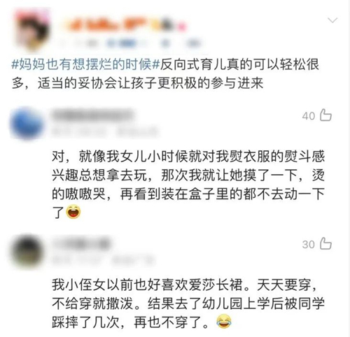 아이들이 자라면서 ‘반항’적인 순간들이 나타나기 마련이다. 오늘날 일부 부모들은 ‘역방향 육아’를 취하고 있는데 일부 네티즌은 아이의 ‘무장해제’ 목적을 달성하기 위해 '아이가 갈 길이 없게 아이의 길을 걷는다'로 요약했다.