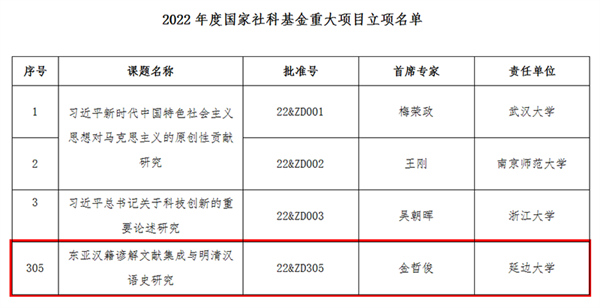 최근 2022년도 국가사회과학기금 중대항목립안명단이 정식으로 공포되였는데 연변대학 조한문학원 김철준교수 연구팀이 신청한 <동아시아 한적 언해문헌 집성과 명청 한어사 연구(东亚汉籍谚解文献集成与明清汉语史研究)>가 성공적으로 립안되였다. 이는 연변대학이 4년만에 재차 우리 나라 철학사회과학연구분야의 최고급 항목을 비준받은 것이다. 이 항목은 국내외 동아시아 한적연구의 최고력량을 집합시켜 최초로 동아시아 한적언해문헌각도에서 력사적 상황과 학술적 가치를 전면적으로 정리하고 동아시아 언어학 학술발전의 순환적 영향을 깊이 파고드는 것이다. 이 연구는 학계의 명청 한어언해문헌에 대한 인식을 갱신시킬 수 있을 뿐만 아니라 명청 한어사연구의 많은 관점과 추측을 가일층 립증하고 검증할 것이다.