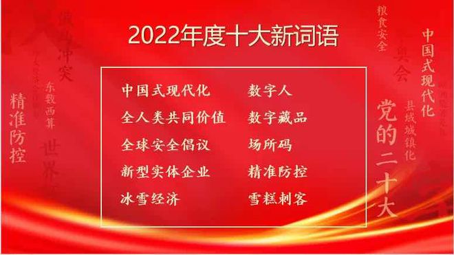 2022년 10대 신조어는 중국식 현대화, 전 인류 공통가치, 글로벌안전제안, 신형실물기업, 빙설경제, 디지털인간(数字人), 디지털소장품(数字藏品), 장소코드, 정밀예방통제, 아이스크림자객(雪糕刺客)이다.